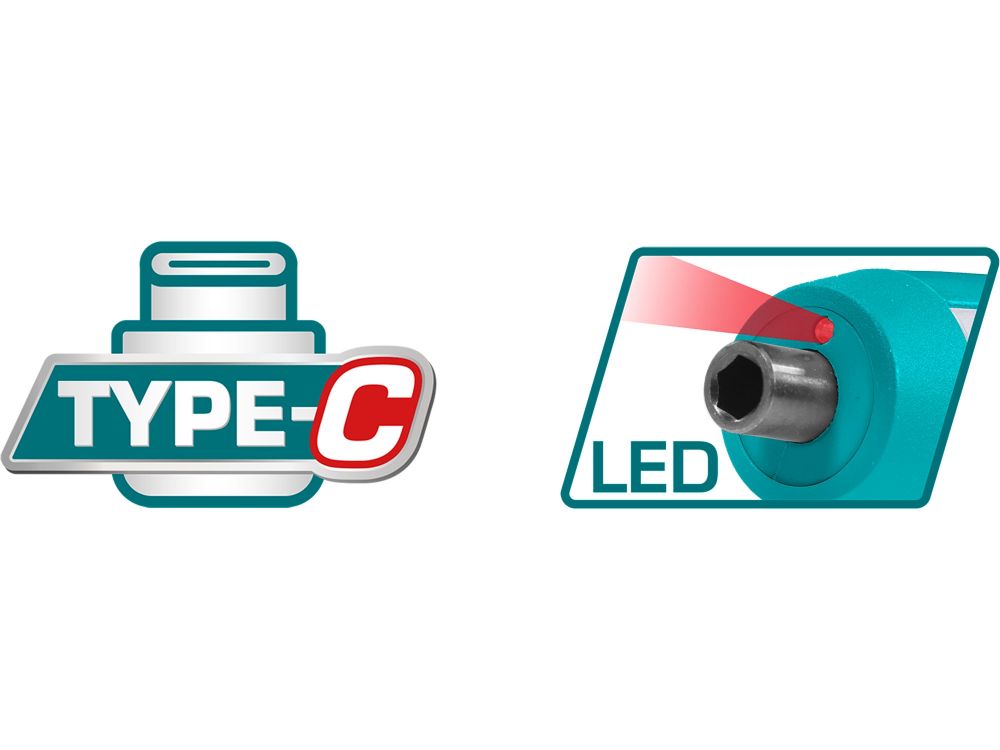 - USB зареждане - С комплект битове TOTAL - LED осветление - Превключвател за въртящ момент и LED индикатор за въртящ момент - Въртене по посока, обратна на часовниковата стрелка, и по посока на часовниковата стрелка - Компактен и удобен дизайнОбхват на доставката: